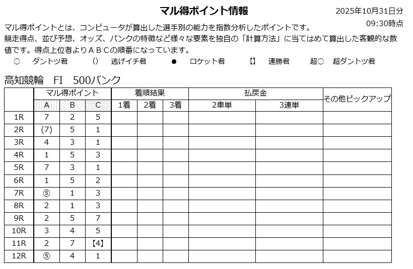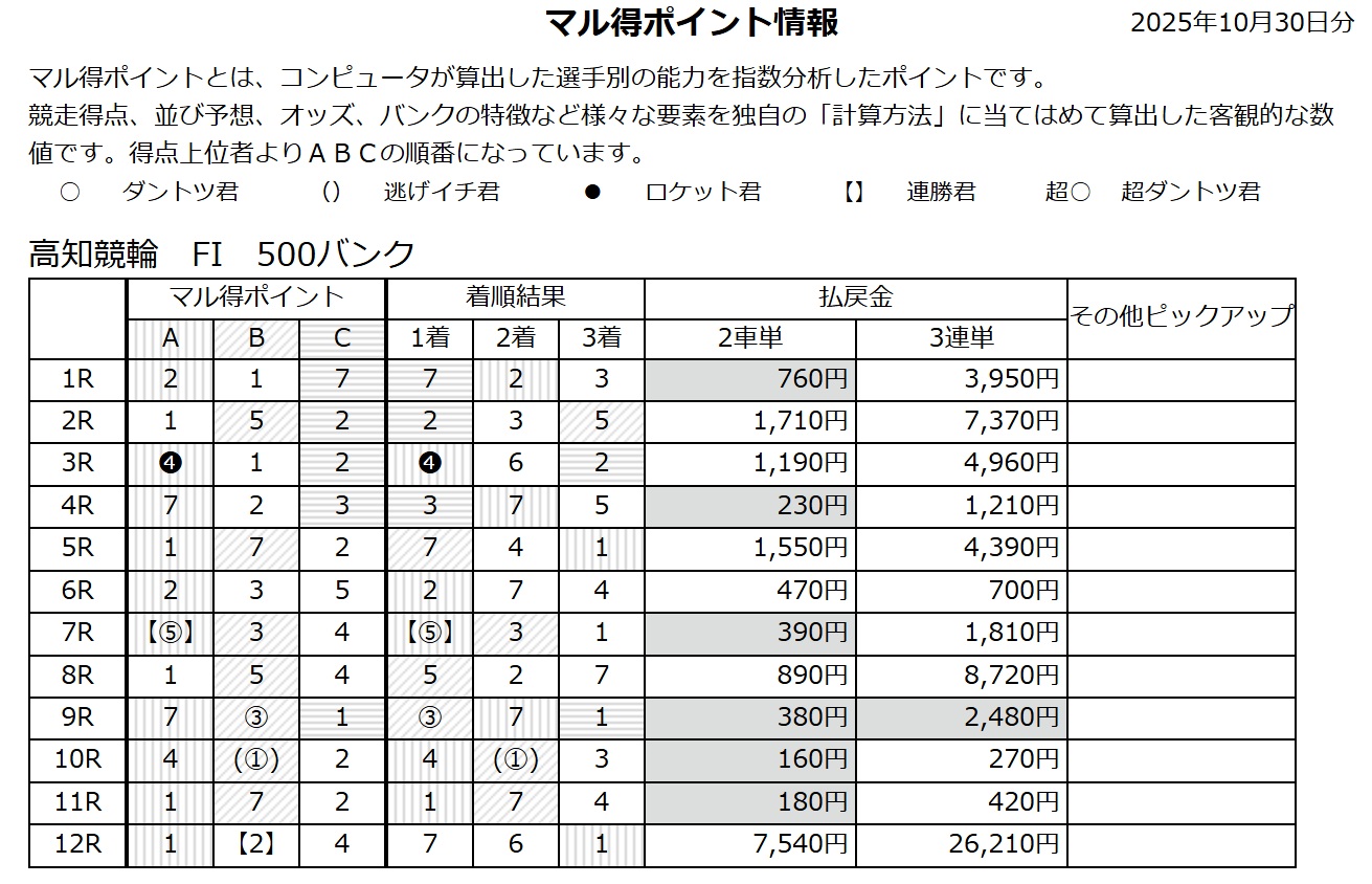 高知競輪 第7回 前節 2日目 10月31日(金) マル得情報