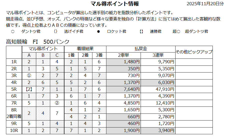 高知競輪 第14回 2日目 11月20日(木) マル得情報