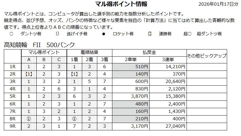高知競輪 第10回 前節 1日目 1月17日(土) マル得情報