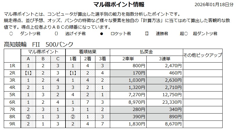 高知競輪 第10回 前節 2日目 1月18日(日) マル得情報