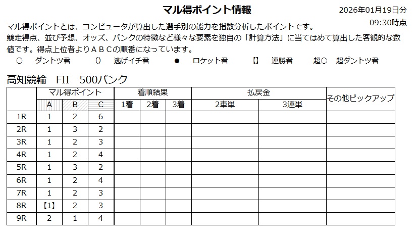 高知競輪 第10回 前節 3日目 1月19日(月) マル得情報