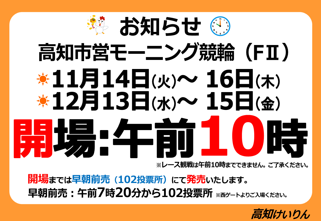 ・11/14~16 高知市営競輪 「夜明けぜよ!モーニング7・日本トーター杯」FⅡ ・12/13~15 高知市営競輪 「グッドモーニング高知・チャリロト杯」FⅡ (第1レース発走予定時刻:午前9時)